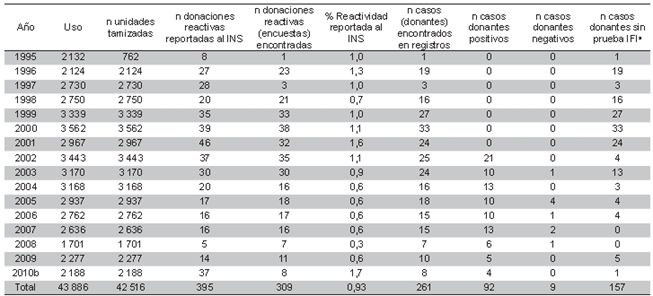 Tabla 1: Información general de recolección, tamizaje y confirmación de unidades reactivas para anticuerpos para T. cruzi en el banco de sangre de la E.S.E María Inmaculada, Caquetá Colombia de 1995 a 2010