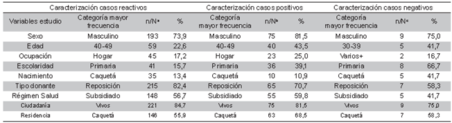 Estudio descriptivo, retrospectivo. La información fue obtenida en el banco de sangre y Laboratorio Departamental de Salud Pública de Caquetá, los datos se colectaron en un formulario estandarizado diseñado en Microsoft Excel® con variables específicas, posteriormente se depuró, corroboró y completó la información con las bases de datos nacionales (Registraduría Nacional de Colombia y Base de Datos Única de Afiliados del Fondo de Solidaridad y Garantía (FOSYGA) del sistema de salud colombiano. En el análisis se utilizó estadística descriptiva uni y bivariada en Microsoft Excel® y un análisis de correspondencia múltiple (ACM) con el programador matemático R® versión 3.0.