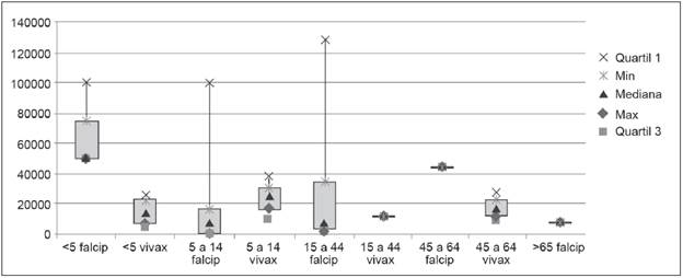 Las complicaciones por malaria fueron encontradas para ambas especies en todos los grupos de edad pero con mayor preponderancia de P. vivax entre los menores de cinco años, el 56% de estos casos ocurren en los menores de cinco años y P. falciparum en personas de más de cinco años (Tablas 3 y 4).
