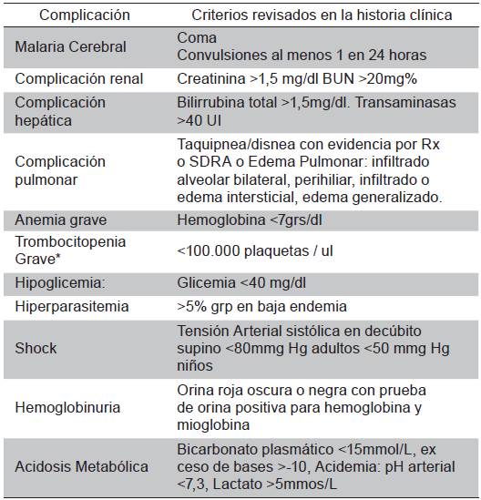 * Parámetros obtenidos de la ficha actual de SIVIGILA para malaria complicada (2011)