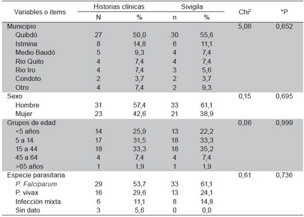 Las comparaciones de las variables demográficas y de especie parasitaria obtenidas de la historia clínica y el SI-VIGILA no muestran diferencias significativas (Tabla 1).