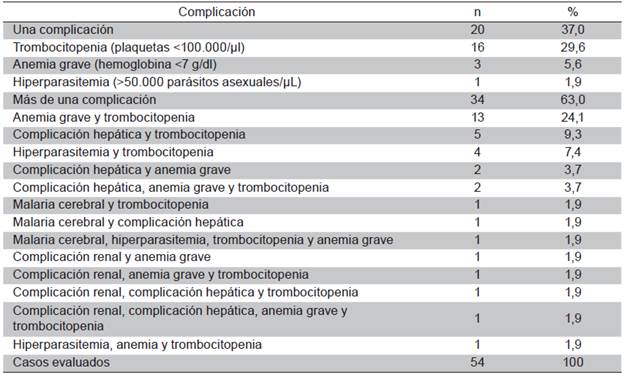 El 37% de los casos presentó una complicación, el 63% presentaron dos o más complicaciones. Las principales complicaciones fueron trombocitopenia y anemia severa, seguido de complicación hepática, hiperparasitemia, insuficiencia renal y malaria cerebral. En tres de los 54 casos, se usó el Artesunato intravenoso. Se utilizó Quinina en el 59,2% de los casos.