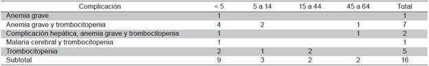 Tabla 3: Complicaciones de la malaria por P. vivax según grupos de edad, Quibdó, 2011