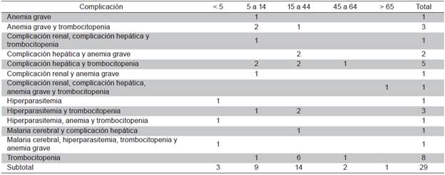 Las infecciones mixtas se notificaron entre menores de 14 años y fueron 6 casos: tres de ellas complicaciones hematológicas, una complicación renal, un caso con hiperparasitemia y trombocitopenia, y un caso con trombocitopenia.