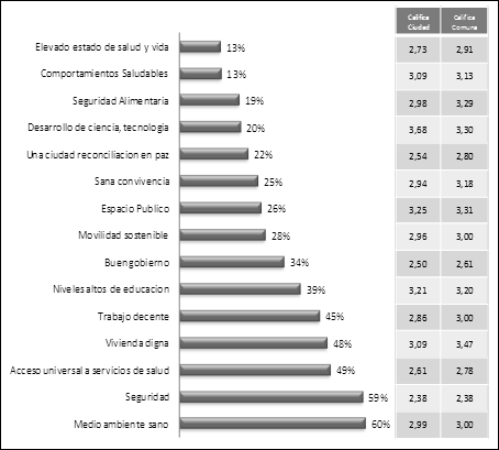 En la encuesta ciudadana participaron 2 737 personas: 46 % hombres y 54 % mujeres; 22 % niños y jóvenes, 46 % adultos jóvenes, 28 % adultos maduros, y 4 % adultos mayores; 69 % profesionales, 25 % con educación secundaria y 6 % primaria. Las características priorizadas, en la medida que fueron seleccionadas por al menos el 40 % de los participantes, corresponden en su orden a: medio ambiente, seguridad, acceso a servicios de salud, vivienda y trabajo. Estas características coinciden con las mencionadas por los grupos abiertos y constituyen determinantes del estado de salud. Además, en cuanto a la percepción sobre el estado actual de las características seleccionadas, en promedio la ciudad obtuvo una calificación de regular a mal (2,92 sobre 5,0), aunque en general las personas ven mejor las cosas en su comuna que en la ciudad en su conjunto (Figura 1).