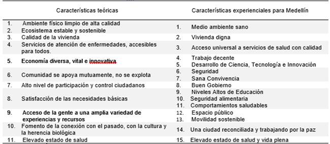 A partir de las expresiones más comunes, se consideraron dos definiciones situacionales: "La Ciudad que permite a los ciudadanos desarrollar mejor las condiciones de salud, bienestar y equidad", y “La ciudad que impulsa diariamente acciones por el bienestar, la equidad y calidad de vida hacia la búsqueda de oportunidades para todos los ciudadanos”, y dos definiciones experienciales: “Una ciudad que manifiesta en sus espacios de vida, el deseo de paz”, y "Una ciudad donde se puede vivir más y mejor". Finalmente, mediante el consenso de expertos y manteniendo como referente lo señalado en la literatura 26, se identificaron y definieron 15 características aplicadas a Medellín Ciudad Saludable (Cuadro 1).
