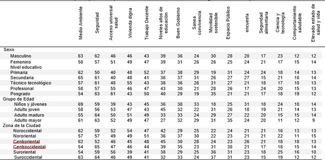 Con respecto al nivel educativo, quienes poseen educación básica, secundaria o profesional están más sensibilizados por el tema del medio ambiente; en contraste, las personas con educación técnica o de posgrado dan prioridad a la seguridad. Es llamativa la importancia del acceso a servicios de salud para quienes tienen mayor nivel educativo. Los niveles altos de educación también ganan prioridad a mayor nivel educativo; en cambio, espacio público y buen gobierno aumentan con menores niveles educativos.