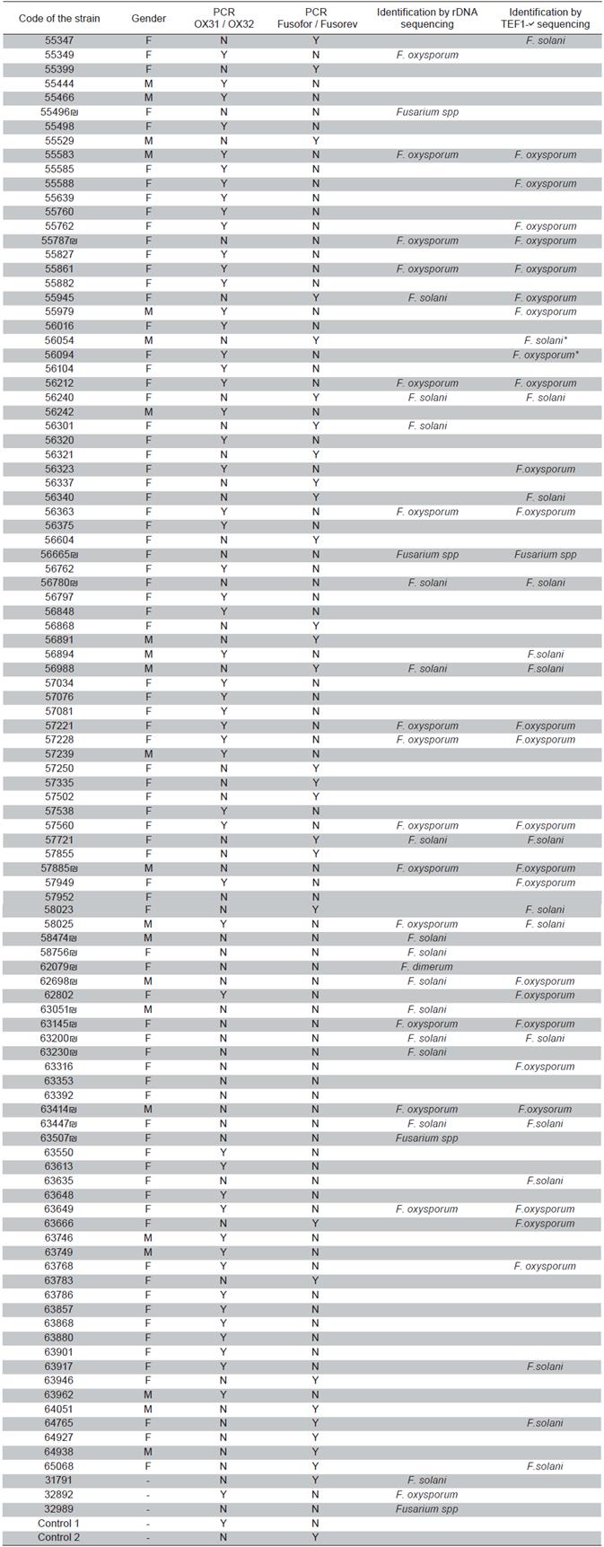 El total de 101 aislamientos fueron detectados como pertenecientes al género Fusarium utilizando un cebador universal de la region 28S DNAr; 52 y 29 aislamientos se detectaron como F. oxysporum o F. salani, respectivamente con los cebadores específicos, y la secuenciación parcial de los genes 28S rDNA o TEF1-α confirmó la identidad de las especies.