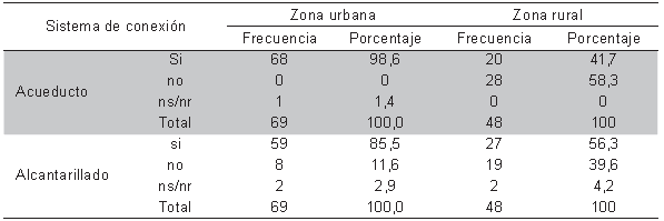 Respecto a la pregunta si tenían conexión a un sistema de alcantarillado, el 73 % respondió positivamente. De las familias que respondieron que si tenían conexión, el 75 % del servicio era prestado por Ingeniería Total y el porcentaje restante utilizaba pozo séptico; quienes no estaban conectados al alcantarillado afirmaron que las aguas iban directamente a la quebrada. Como era de esperarse, fue más frecuente 85,5 % la conexión al alcantarillado en la zona urbana que en la rural 56,3 % (Tabla 2).