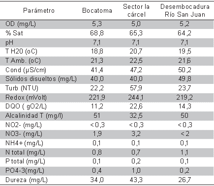 El agua mostró signos de contaminación desde aguas arriba de la bocatoma hasta su desembocadura, no siendo significativa la diferencia en los tres puntos muestreados, debido posiblemente a las condiciones topograficas que ayudan a la oxigenacion y por ende a disminuir los efectos contaminantes producidos por las actividades antropicas (Tabla 3).