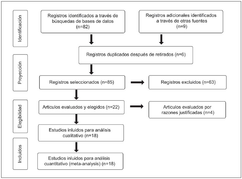 Al realizar la búsqueda de literatura general sobre estudios de prevalencia de leptospirosis, se encontraron noventa y un artículos a nivel mundial; ochenta y dos de ellos incluidos en las bibliotecas definidas para la búsqueda y nueve encontrados en otras fuentes, de estos se eliminaron seis artículos por duplicidad en una o dos bibliotecas científicas empleadas para la recolección de la información, quedando 85 artículos, de los cuales se excluyeron 63 por no cumplir con los criterios de inclusión y exclusión, para un resultado final de 22 artículos en total (Figura 1).