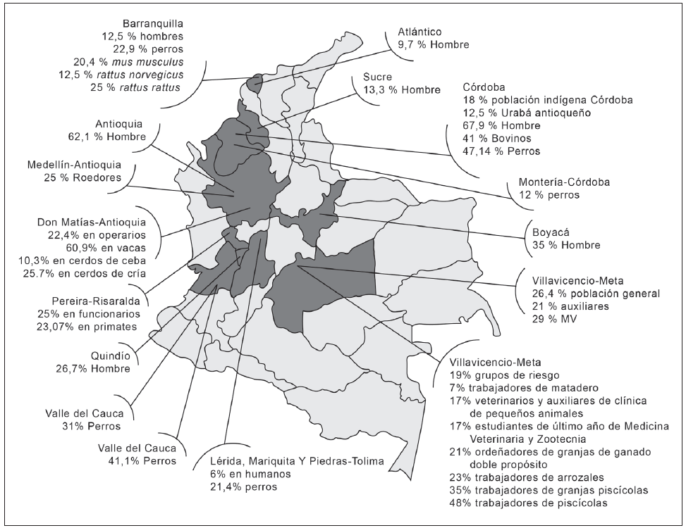 Las prevalencias encontradas en las diferentes poblaciones estudiadas son muy variables, lo que depende del número de sujetos estudiados, sin embargo en el hombre las prevalencias van del 6 % al 47 %, en perros del 12 % al 41 %, en roedores del 12,5 % al 82 %, en bovinos del 41 al 60 %, en cerdos del 10,3 % al 25,7 % y en animales silvestres se encontró una prevalencia del 23 % para primates no humanos. Los autores con el mayor número de investigaciones sobre seroprevalencias de leptospirosis en Colombia, encontrados en esta revisión de literatura, son Romero, quien tiene investigaciones en diferentes regiones del país y Agudelo Ávila, quien concentra sus investigaciones en el Departamento de Antioquia.