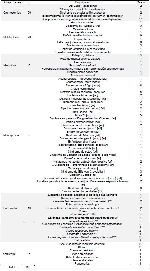 En cuanto a la clasificación de los diagnósticos encontrados (Tabla 2), se observó que 13,2 % (n=20) correspondían a enfermedades cromosómicas (incluyendo sospecha de síndromes de microdeleción-microduplicación); 40,1 % (n=61) a enfermedades monogénicas o sospecha de estas; 22,4 % (n=28) a enfermedades de tipo multifactorial, 5,9 % (n=9) de tipo idiopático y 9,8 % (n=15) de tipo ambiental (Tabla 2). El 50,8 % de los diagnósticos o su sospecha fueron aportados por casos únicos, excepto en los diagnósticos de MPS III, Ellis-Van Creveld, X Frágil, Distrofia Cintura Miembro, Esclerosis Tuberosa y sospecha de Síndrome de Norrie.