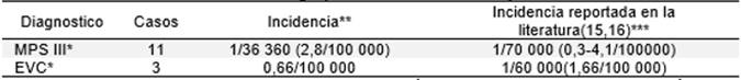 Tabla 3: Incidencia de los agrupamientos de MPS III y EVC encontrados