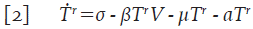 Asuma que la población de células T en reposo T r , es liberada en el organismo a una tasa constante σ y que mueren por causas no relacionadas con la infección a una tasa de proporcionalidad μ. Adicionalmente, en presencia de infección, éstas células se infectan con una probabilidad β; por lo tanto, el número promedio de células T en reposo que se infectan en un tiempo t está dado por βT r V y la ecuación que describe su variación es,