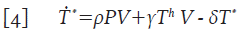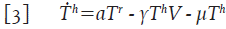 Donde γT h V representa el número promedio de células colaboradoras T h que se infectan y μΤ h es el número promedio de células T h que mueren por causas no relacionadas con la infección. Las células T h infectadas, se vuelven productoras de partículas virales de manera inmediata; por lo tanto, constituyen un flujo de entrada en la dinámica de las células T * , con lo que la segunda ecuación de 1 queda de la forma: