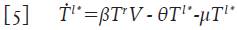 Las células T en reposo que se infectan (la cantidad βT r V en la ecuación 2) dan origen a células infectadas en estado de latencia, ya que la producción viral dará inicio tras la activación inmunológica de la célula 4,12-14. Denote con la variable promedio T l* =T l* (t) a las células T infectadas en estado de latencia; asumiendo que su tasa de muerte es también μ, se puede formular su variación mediante la ecuación: