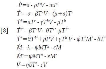 Donde la variable V=V(t) denota la concentración promedio de partículas virales en un tiempo t, la subpoblación de células que recoge las clases de células presentadoras de antígenos se denota con la variable promedio P=P(t) y las células T infectadas y activadas por el virus para iniciar la replicación viral, se denotan con la variable promedio T * =T * (t) las cuales producen grandes cantidades de partículas virales 4. La interpretación de los parámetros involucrados puede encontrarse en la Tabla 1. Este modelo tiene en cuenta que las células presentadoras de antígenos buscan, engullen y analizan el antígeno para luego presentarlo a los linfocitos T circundantes en un proceso denominado sinapsis inmunitaria o simplemente presentación de antígenos 3,4. También se asume que las células T infectadas están activadas y que inmediatamente se infectan, dando inicio a la replicación viral; los supuestos que recoge el modelo 1 se pueden estudiar con detalle en 6,7.