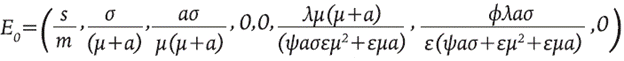 El sistema 8 tiene dos puntos de equilibrio denotados por E 0 (trivial) y E 1 (no trivial). El equilibrio trivial representa el estado alcanzado en ausencia de la enfermedad, es decir, muestra los valores hacia los cuales tienden las poblaciones cuando no hay infección y está dado por: