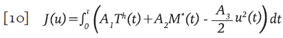 Sujeto a las condiciones iniciales necesarias para las simulaciones. Adicionalmente, V * =V * (t) es la concentración promedio de partículas virales defectuosas producidas por el efecto de los IP. Se propuso una funcional de réditos que tiene en cuenta la población de células T colaboradoras T h y las células activas citotóxicas inmunes M * para maximizarias al tiempo que se minimiza el costo de la aplicación del control. El funcional J está definido por la expresión;