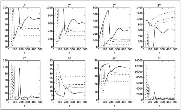 Se puede observar que M y M * están presentes en el sistema todo el tiempo debido a la suposición de que la activación de inmunidad puede ocurrir en contra de cualquier patógeno. El equilibrio no trivial no se muestra porque su expresión es muy larga, pero se observa de manera numérica en la Figura 1, en el valor final de cada población.