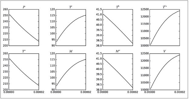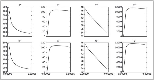El parámetro ρ es el que genera los mayores máximos (picos), aunque no influye mucho en el tamaño de las poblaciones finales, como sí ocurría con η. Otro aspecto que vale la pena destacar es que el parámetro ρ solo está presente en las ecuaciones para P y T * , pero su influencia se reflejaba en todas las poblaciones. Por lo tanto, se muestra la Figura 2, en la cual se ha capturado la variación de los máximos alcanzados por las poblaciones del modelo 8 al variar el parámetro ρ (eje horizontal). Se observa que a medida que ρ crece de cero a 2.0xl0 -5 , el número máximo promedio de las poblaciones P, T h , T * y M * disminuye, situación interesante, ya que una disminución en P, T h y M * , implica un mayor nivel de infección en el organismo. Por otro lado, el aumento de T l* implica que hay muchas células infectadas en estado de latencia. Como otra observación preliminar, puede decirse que disminuir ρ es conveniente para controlar la infección. Comportamientos análogos se obtuvieron al realizar simulaciones para β y γ; es decir, que según este modelo, es recomendable reducir las probabilidades de infección con el virus de todas las poblaciones celulares susceptibles.