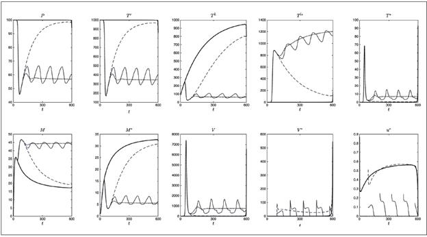 Los detalles de la metodología empleada pueden consultarse en 21,22. Con los parámetros de la Tabla 1 se realizó la simulación del sistema 9 y la terapia óptima u * dada en 12, con lo que se obtienen las gráficas en línea continua gruesa de la Figura 4.