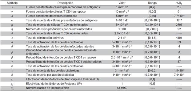 El R 0 describe «el número secundario de células infectadas que se obtienen a partir de una sola célula infectada en una población enteramente susceptible». Cada uno de los sumandos que componen a R 0 representa el aporte que hacen las poblaciones celulares susceptibles a la infección, al tener contacto con el virus: células presentadoras de antígenos, células colaboradoras y células en reposo. La importancia de R 0 radica en que desempeña el papel de un umbral, el cual determina condiciones de estabilidad, tal y como se muestra en la proposición 3, en cuya demostración se empleó la teoría clásica de los signos de los valores propios 18 y el criterio de Routh-Hurwitz.