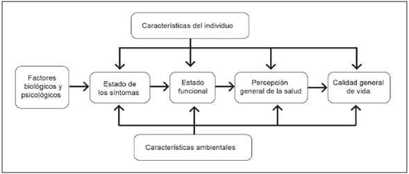 En este sentido, la literatura referencia una teoría de mediano rango sobre CVRS basada en el modelo de Wilson y Cleary, el cual es comúnmente citado en las disciplinas del cuidado de la salud y propone relaciones entre los factores que afectan la CVRS 1. Este modelo integró dos diferentes tipos de marcos comprensivos de la salud, unos desde el paradigma clínico, enfocados en agentes etiológicos, procesos patológicos y resultados fisiológicos y clínicos, y por otro lado, desde el paradigma de las ciencias sociales, centrados en dimensiones de funcionamiento y bienestar general 10 (Figura 1).