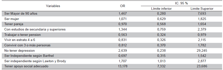 Cross-sectional study on a population of 107 604 senior adults, with a sample of 660 people. Two-stage sampling was carried out using the Pfeiffer test, socio-demographic survey, Yesavage depression scale, self-perceived health questionnaire, Barthel Lawton and Brody scale, Multicultural Quality of Life Index, and Duke Questionnaire. Descriptive statistics and a multivariate logistic regression model were used. The ethical aspects of human studies were considered.