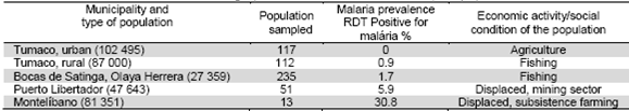 Un total de 548 voluntarios fueron estudiados en Córdoba y Nariño. La proporción de casos positivos de malaria fue 3 % (17/548). Las infecciones mixtas de malaria se presentaron en un 47 % (8/17). La prevalencia de fiebre, temperatura mayor o igual a 38oC, fue 2.7 % (15/548). Dos pacientes febriles fueron positivos para malaria. La prevalencia de casos asintomáticos se presentó en 88 %.
