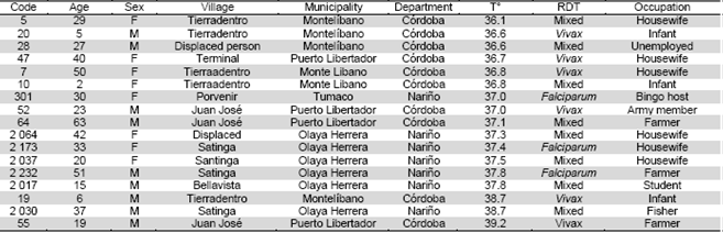 The sample consisted of 548 participants from the departments of Córdoba and Nariño, Colombia. The proportion of positive malaria cases was 3 % (17/548), in which the prevalence of malaria mixed infections was 47 % (8/17). Regarding fever, temperature over 38.0o C, its prevalence was 2.7 % (15/548). Only two febrile patients tested positive for the disease. Prevalence of asymptomatic malaria cases among all positive cases was 88 %.