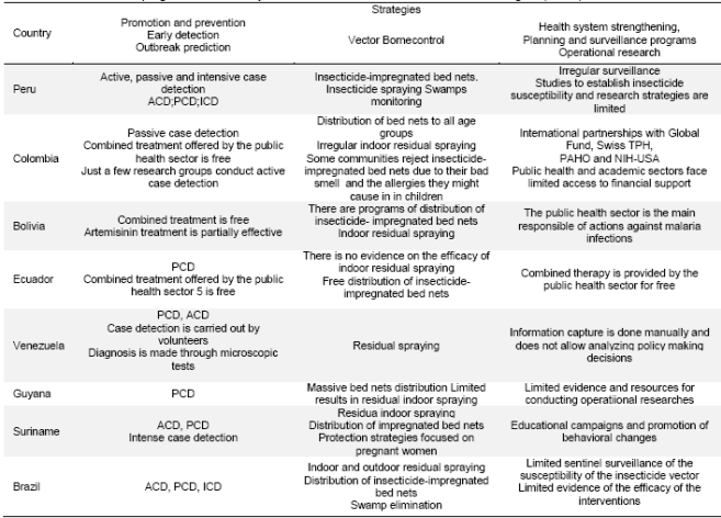 Table 3 presents most relevant aspects of the malaria control program of the eight countries on the same Amazon Region where Colombia also share similar eco-epidemiological conditions. These findings suggest limited actions of surveillance and budget constraint. The case detection in some areas combine intensified active case detection. The activities are responsibility of the public sector, the review do not find the private health sector participation in most of the countries. The surveillance system in Colombia and other countries present data from years before 2013, there is not available data for more recent years. The surveillance system is not opportune and sensible in case detection. It is widely suggest levels of under report around 35 % 15.