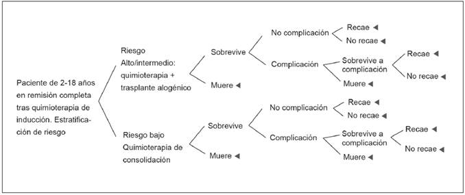 Las ramas del árbol son de estructura idéntica. En cada alternativa se puede o no sobrevivir al procedimiento; quienes sobreviven cuentan con una probabilidad de desarrollar efectos adversos, y estos pueden eventualmente llevarlos a la muerte; finalmente, quienes no enfrentan complicaciones, o se reponen a ellas, salvo que presenten recaída, alcanzan la expectativa de vida de un niño colombiano sin desarrollar neoplasias.