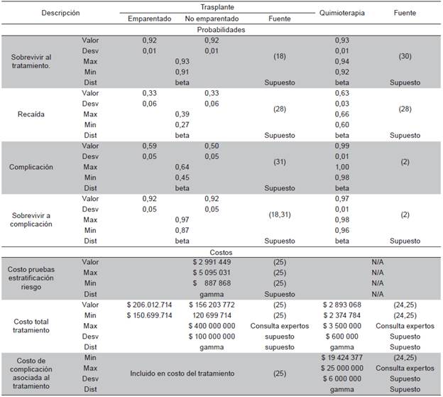 La Tabla 1 contiene los valores de efectividad y costos empleados en el modelo. La información sobre los resultados relevantes en salud fue tomada de ensayos clínicos aleatorizados y del reporte para el 2010 del Center for International Blood & Marrow Transplant Research (CIBMTR) 17.