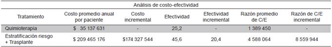 El análisis de costo-efectividad muestra que la estratificación y posterior trasplante con progenitores hematopoyéticos tiene una mayor efectividad, sobrepasando a la quimioterapia en 20,4 años de sobrevida libre de enfermedad por persona, pero superando también su costo en $174 327 544, dando como resultado que cada año de vida adicional a los logrados con quimioterapia le cuesta al sistema $8 559 944. (Tabla 2).