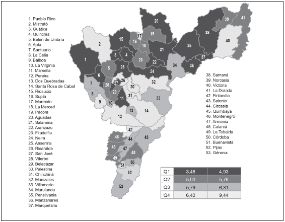 En la Figura 1 se observa el mapa de los Departamentos del Eje Cafetero con sus municipios y los valores promedio del indicador PIB per cápita. Los municipios se presentan según cuartiles del promedio del PIB per cápita 2009-2011. Hay un predominio del 25 % del PIB per cápita más bajo en los municipios del occidente, norte y oriente del Eje Cafetero.