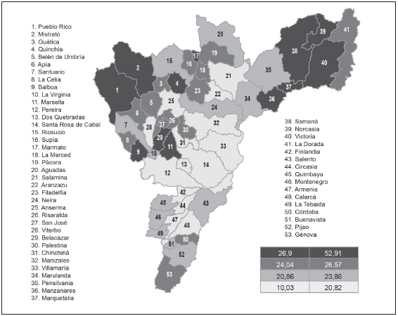 En Colombia, aunque el modelo de descentralización creó condiciones básicas para que las entidades territoriales tuvieran un buen desempeño en varios aspectos de la gestión pública, como la disminución desigualdades territoriales, no ha logrado su cometido. Aunque para algunos el problema se resuelve precisando las competencias e impactos en sectores diferentes a educación, salud, agua potable y saneamiento básico 15, la realidad de los municipios es que, excepto las capitales de departamento, son categoría seis. Además, Norcasia (Caldas), Mistrató y Pueblo Rico (Risaralda) son municipios económicamente muy insuficientes y los demás son económicamente insuficientes. Se exceptúan Manizales (Caldas), Buenavista (Quindío) y la Celia (Risaralda), clasificados como económicamente suficientes 16, aspectos que se relacionan con las condiciones y calidad de vida de los pobladores.