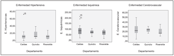 Figura 3: Diagrama de cajas de los promedios de las tasas de mortalidad por enfermedad hipertensiva, isquémica, cerebrovascular. Caldas, Quindío, Risaralda. 2009, 2010, 2011.