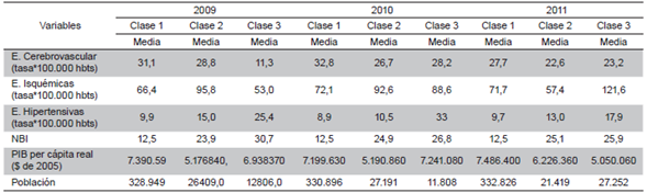 Los municipios de la primera clase tienen el PIB per cápita más alto; el NBI más bajo; el promedio de la tasa de mortalidad por enfermedad cerebrovascular más alto; el promedio de la tasa de mortalidad por enfermedad hipertensiva más bajo y el promedio de población más alto. Lo que se destaca de la clase dos es que presenta el PIB per cápita más bajo y el promedio de la tasa de mortalidad por enfermedad isquémica más alto. La clase tres presenta el NBI más alto, el promedio de las tasas más bajo en mortalidad por enfermedad cerebrovascular y enfermedad isquémica, mientras la mortalidad por enfermedad hipertensiva es la más alta. Es la clase de más bajo promedio poblacional (Tabla 1).
