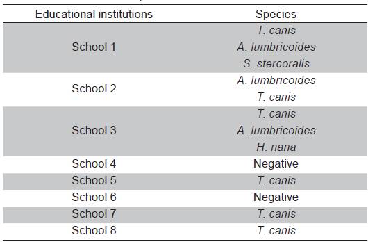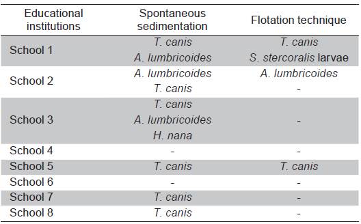 It was found that 77 % of the analyzed institutions were positive for helminth eggs and larvae. Among the eggs and larvae identified, the main were Ascaris lumbricoides and Toxocara canis. Pearson's chi-square test identified the best results when using the spontaneous sedimentation method.