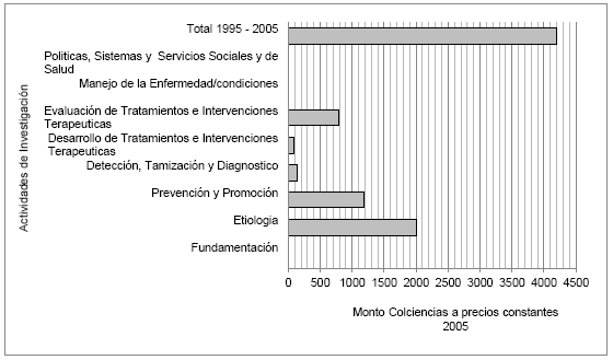 Figura 1: Distribución del financiamiento de los proyectos de malaria por actividades de Investigación, financiados por Colciencias entre 1995 y 2005