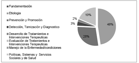 En la actividad de investigación con el código 4.0 sobre detección, evaluación y diagnóstico que hace referencia a investigaciones relacionadas con proyectos que determinan el desarrollo y evalúan los pronósticos de diagnóstico, los marcadores predictivos y las tecnologías solo se identificó un proyecto en la subcategoría que hace referencia a tamizajes en la población.