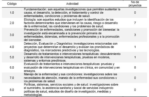 Los códigos describen 8 actividades de investigación así: El código 1.0 hace referencia a fundamentación, el 2.0 Etiología, el 3.0 Prevención de enfermedades, condiciones y promoción del bienestar, el 4.0 Detección, evaluación y diagnóstico, el 5.0 Desarrollo de tratamientos e intervenciones terapéuticas, el 6.0 Evaluación de tratamientos e intervenciones terapéuticas, el 7.0 Manejo de la enfermedad y sus condiciones y el 8.0 Políticas, sistemas, servicios sociales y de salud 8.