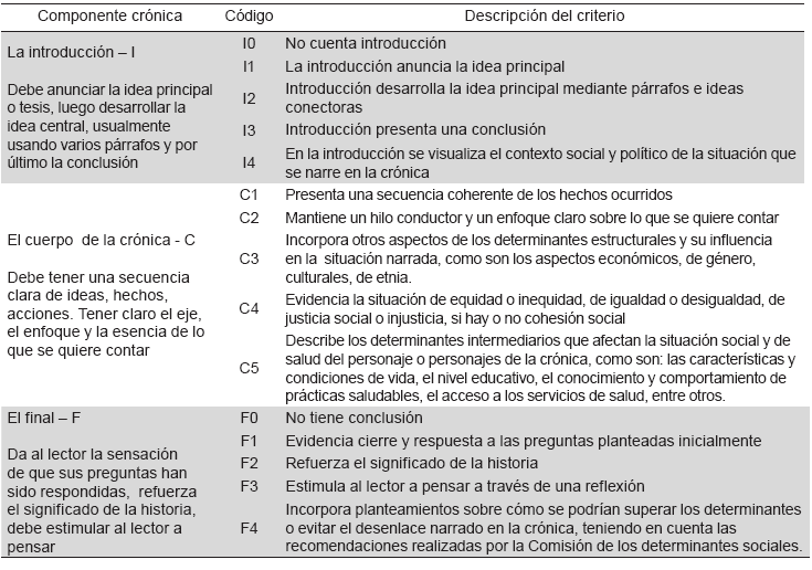 Para el análisis del contenido de las crónicas, se diseñó una matriz de categorías que incluía: los componentes de una crónica ENT#091;la introducción (I), el cuerpo (C) y el final (F)ENT#093; y la descripción de los criterios de cada componente, en la cual se especificaba que conceptos relacionados con los determinantes sociales debían ser incorporados. Se definió que en el cuerpo se incorporarían la mayoría determinantes estructurales e intermediarios como se describe en la tercera columna de la matriz, como se indica en el Cuadro 1.