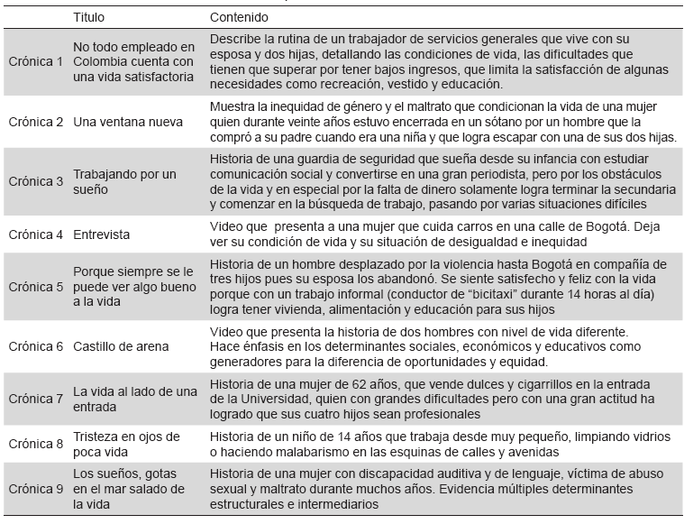 Las crónicas analizadas en el proyecto mostraron realidades sociales en torno a historias de vida de un protagonista que reflejaron desigualdades, inequidades, determinantes estructurales e intermediarios que permitieron a los estudiantes el acercamiento a los conceptos teóricos en concordancia con los criterios definidos en la matriz de análisis.
