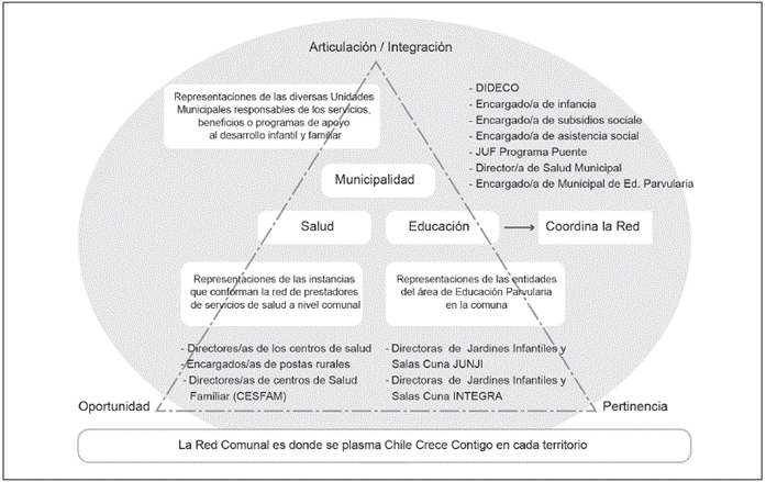 El CHCC establece su base en la articulación de los recursos ya existentes en los territorios locales. Cada repartición pública pone a disposición del sistema su oferta programática en materia de primera infancia y, sumado a lo anterior, el sector de educación, aumenta la oferta de servicios de apoyo al cuidado infantil y a la educación temprana (Figura 1). Lo anteriormente planteado, busca crear una red articulada e integrada de servicios con el fin de responder oportunamente a los requerimientos de las niñas o niños y sus familias 18.