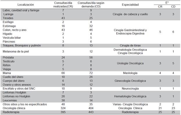Con base en el número de consultas con diagnóstico de cáncer realizado en el año 2015 en Bogotá DC, según reporte del Sistema Integral de Información de la Protección Social (Sispro), se agruparon según la distribución presentada por el reporte de incidencia, mortalidad y prevalencia de cáncer en Colombia, 2007-2011 5. Se estableció el número de consultas por día, calculando 243 días de programación de lunes a viernes en ese año (se excluyen fines de semana y festivos). Las consultas por día se agruparon por especialidad responsable de su tratamiento y su sumatoria se dividió por el número de consultas (18 consultas) correspondiente al agendamiento usual para especialistas en el sistema de salud de Colombia de tres pacientes por hora y una dedicación a consulta de seis horas diarias. El cociente da como resultado el número de especialistas responsables de la atención si se cumplen estos parámetros. En el caso de los oncólogos clínicos, se asumió la necesidad de valoración por esta especialidad en el 100% de los tumores excepto en los que el manejo en este modelo se hace por el hemato-oncólogo. En la consulta de radioterapia se asumió que todos los cánceres requirieron de valoración por esta especialidad. En el cálculo el número de especialistas se aproxima al número entero siguiente para compensar la existencia de cánceres en otros sitios y los no especificados, dedicación a cirugía e interconsulta.
