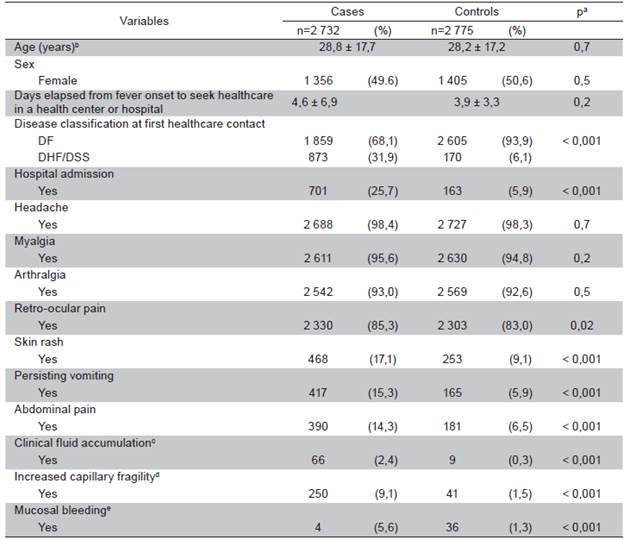 Table 1 shows the study population characteristics for selected variables. The mean age of cases and controls was 27, 8±18,0 and 26,9±17,8 years respectively, and this difference did not reach statistical significance. When compared with controls, cases were more likely to be classified at first healthcare contact as DHF/DSS patients requiring hospital admission. Cases also had a significant higher prevalence of retroocular pain (85,3 % vs. 83,0 %), skin rash (17,1 % vs. 9,1 %), persisting vomiting (15,3 % vs. 5,9 %), abdominal pain (14,3 % vs. 6,5 %), clinical fluid accumulation (2,4 % vs. 0,3 %), increased capillary fragility (9,1 % vs. 1,5 %) and mucosal bleeding (5,6 % vs. 1,3 %).