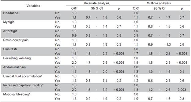 The presence of skin rash (OR=1,7; 95 % CI 1,5-2,1), persisting vomiting (OR=1,8; 95 % CI 1,5-2,3) and increased capillary fragility (petechiae, ecchymosis, hematoma or positive tourniquet test; OR=1,8; 95 % CI 1,2-2,6) were associated with laboratory-positive infection.